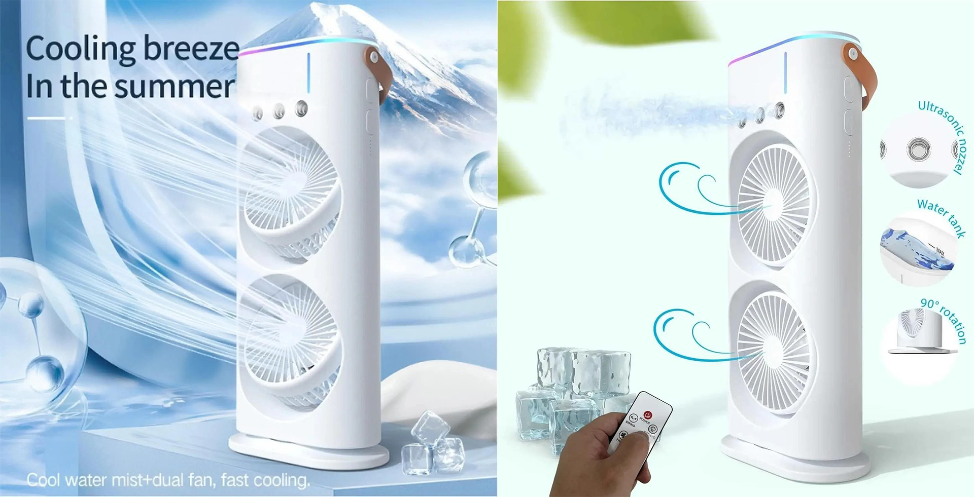 "The dual spray works like magic. It cools down my room in minutes. Battery backup is solid too. highly recommended."